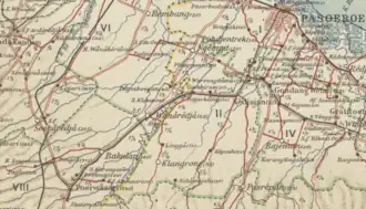 Map issued in February 1946 showing the city of Pasuruan including the main railway line of Staatsspoorwegen (SS) and PsSM's steam tram line]]
