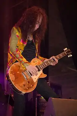 Pata is noted as the only member of X Japan who plays American-made instruments, almost always seen playing a vintage Gibson Les Paul. His favorite is a black Les Paul Custom that is estimated to be from around 1972.[52][b] Nicknamed "Jōmu" (常務; "Managing Director"), he has owned it since his amateur days.[53] Its frets have been replaced many times, the bridge has been replaced several times, and the back of the neck was shaved down to be easier to play. The neck has also been broken and repaired twice, which has resulted in the serial number on its headstock being obscured when it was repainted.[55] He also often uses a 1955 Goldtop Les Paul Standard, whose paint is rubbed down to the wood, earning it the nickname "Hage" (ハゲ; "Bald").[53] It originally belonged to a guitar tech, but after borrowing it, Pata traded a 1959 reissue for it.[56] Its pickups and tailpiece were already altered when he acquired it, the former having been swapped out for humbuckers.[53] Previously, Pata often used a yellow 1959 Standard nicknamed "Ichi-Gō" (1号; "Number 1").[53][c] He bought it in Los Angeles just before recording X's album Jealousy (1991), which features the guitar extensively.[57] Although he still uses it for recording, the 1959 has been retired from live performances since 2008 due to its value, which is reportedly enough to buy a house.[53] Since X Japan's reunion, Pata occasionally uses a wine red 1976 Custom, which has a Tom Holmes 453 pickup in the rear.[53] He also owns a white 2008 Custom that he often uses at home and calls "Panda", because the back of its headstock is painted black.[58]