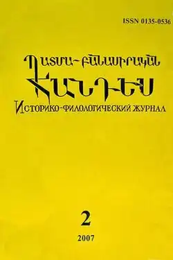 Patma-Banasirakan Handes (Armenian: Պատմա-Բանասիրական Հանդես (ՊԲՀ, PBH); Russian: Историко-филологический журнал, Istoriko-Filologicheskii Zhurnal; lit.'Historical-Philological Journal')[1] is a quarterly peer-reviewed academic journal published by the Armenian National Academy of Sciences. It covers research on Armenian history (particularly material related to the ancient and medieval periods), art history, literature, and linguistics.[2] The journal also publishes discussions and debates, book reviews and also has special sections devoted to science news and Armenian Diasporan affairs.[2] It occasionally publishes obituaries and biographies and commemorates the lives of noted scholars involved in Armenian studies. It is the Academy's "flagship journal".[3]