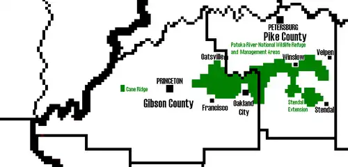 The Patoka River National Wildlife Refuge and Management Area, established in 1994, is a collection of wildlife refuges and habitats situated along the Patoka River in Gibson and Pike counties in southwestern Indiana. It consists mostly of the main body refuge along nearly 40 miles (64 km) of the river's course from just north of Francisco, Indiana, to just west of Velpen, Indiana.[1] Other areas include the Cane Ridge Wildlife Management Area managed by Duke Energy and located immediately south of Gibson Lake and the Gibson Generating Station in northwestern Gibson County, 9 miles (14 km) east of the main body. The refuge is authorized for 23,962 acres (96.97 km2). As of 2010, 6,149 acres (24.88 km2) are owned by the U.S. Fish and Wildlife Service.