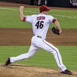 At the trade deadline, Corbin was traded to the Diamondbacks with pitchers Joe Saunders, Rafael Rodríguez, and Tyler Skaggs for Dan Haren.[11][18] The Diamondbacks assigned Corbin to the Visalia Rawhide of the California League.[19] Corbin pitched to a 1.38 ERA in 26 innings with Visalia.[20] In 2011, while pitching for the Double-A Mobile Bay Bears, he set a franchise record with 27+1⁄3 consecutive scoreless innings.[21] He finished the season with a 9–8 win–loss record and 142 strikeouts in 160+1⁄3 innings pitched.[3] His strikeout total led the Southern League, and Mobile won the league championship.[22]