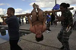 This technique is believed to originate from Portuguese slave traders, which used pau de arara as a form of punishment for disobedient slaves. Its use has been more recently widespread by the agents of the political police of the Brazilian military dictatorship against political dissidents in the 1960s and 1970s and is still believed to be in use by Brazilian police forces,[2] although outlawed.[3] This torture technique was also used in Auschwitz during World War II, where it was known as the Bogerschaukel (the Boger seesaw) or Boger swing, named after the SS officer who first applied it, Wilhelm Boger.[4][5][6][7]