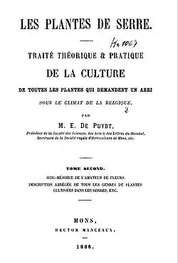 Paul-Émile was the second child of four children from the second marriage of his father, who married in 1799 Marie Adélaïde Jeanne Michot (c. 1777 – 1858).[2] As a botanist, Paul Émile de Puydt notably wrote on orchids.[3] The standard botanical author abbreviation De Puydt is applied to species he described.