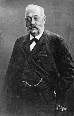 Paul Singer (16 January 1844, Berlin – 31 January 1911) was a leading Marxist in and representative of the Social Democratic Party of Germany in the late 19th and early 20th centuries. Co-Chairmen of the SPD (which he joined in 1878) along with fellow Marxist August Bebel from 1890 until his death in 1911. His grave now forms part of the Memorial to the Socialists (German: Gedenkstätte der Sozialisten) in the Friedrichsfelde Central Cemetery, Berlin.