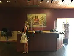 The cyclorama, under the genius of this man, came out a masterpiece. The only concession Paul asked, to which Walter Knott readily agreed, was the exclusive right to manufacture and sell art souvenirs, booklets and paintings on the premise.[12] Von Klieben lived on the farm and had his studio "at the end of the Ghost Town Trail," in "the adobe building which adjoins Ghost Town" that was completed shortly before February 1942 and was constructed of adobe bricks made on the property. This building is likely that which is now used as the entrance to Spurs restaurant.[13][14]