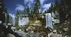 Paulina Creek Falls is a cascade and plunge waterfall from a streambed draining from Paulina Lake in Newberry National Volcanic Monument, south of Bend, Oregon. The waterfall is notable for its side-by-side drop of 80 feet (24 m) that surrounds a small island at the edge of the cliff.[1][2]