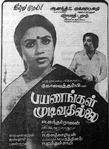 Payanangal Mudivathillai (transl. Journeys never end) is a 1982 Indian Tamil-language romantic drama film written and directed by R. Sundarrajan. The film stars Mohan and Poornima Jayaram, with Rajini, S. Ve. Shekher, Poornam Viswanathan, Rajesh and Goundamani in supporting roles. Its plot revolves around a woman who falls in love with a singer whom she helped to rise to fame but struggles to declare her love for him.