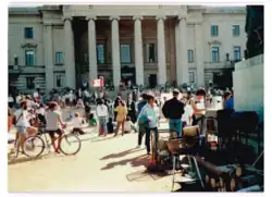 Photograph of Peace Village Demonstration in Winnipeg, Manitoba, Canada, 1990. View of the steps of the Manitoba Legislative Building from the centre of the Village.