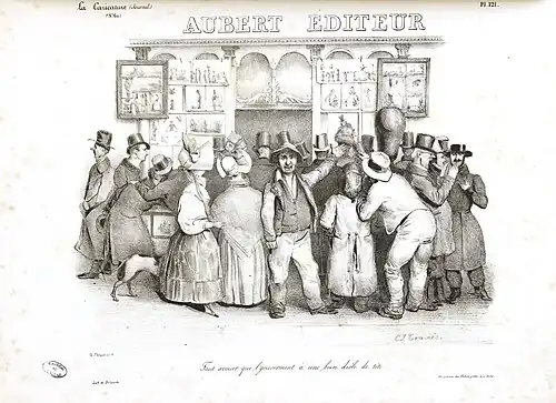 In October 1829, Philipon contributed to the creation of La Silhouette, the first French periodical to exploit the new possibilities of lithography by regularly publishing illustrated content.[54] His role in the venture has been described by James Cuno as "central",[55] while David Kerr considered it "difficult to determine"[54] and possibly limited to organizing the lithographic section.[56] Two months later, in December 1829, after his brother-in-law Gabriel Aubert faced financial difficulties, Philipon partnered with him to establish Maison Aubert, a "caricature shop"[55] that aimed to supply prints created by Philipon and his professional network.[51]