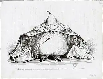 As Gabriel Weisberg noted, interpreting lithographs produced during the July Monarchy can be challenging today due to the artists' use of multiple layers of meaning intended for different audiences, as well as their references to fleeting events while also aiming for a certain universality.[114] The pear became a multifaceted symbol. On one hand, as an emblem of the king, it represented both his face and body, with various connotations, including scatological and sexual meanings.[115] On the other hand, it expressed the "graphic convergence of the three elements constituting the July Monarchy": its sovereign, its social base—the bourgeoisie—and its ideology of moderation.[116] Finally, it was associated with political humor.