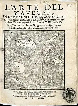 In 1545 Medina published his most important work, Arte de navegar ("The Art of Navigation") in eight volumes. It was dedicated to the future Philip II, in support of his quest to be appointed royal cosmographer.[2] This work was an overview of existing knowledge on this subject, and was probably a revision and expansion of his "Book of Cosmography", which had already been examined by the Council of the Indies. Arte was the first treatise on navigation to be published in Spain (although a book by Martín Cortés de Albacar, published in Cádiz in 1551, was also important). The senior cosmographer Alonso de Chaves demonstrated that Medina's Arte was a compilation, made with the assistance of other writers. Diego Gutiérrez and other authors claimed that they had helped with parts of the book, and Medina himself acknowledged the assistance of Francisco Faleiro and Alonso de Santa Cruz on other occasions, but not with the writing of Arte. The book was internationally disseminated and quickly translated into several European languages: it was translated into French fifteen times between 1554 and 1663, five times into Dutch (1580-1598), three times into Italian (1554-1609) and twice into English. This work contributed considerably to the development of navigation on the high seas.