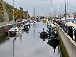 The works were justified by the Department of Infrastructure on the grounds that the silt was blocking berths, and because the Isle of Man government could not afford to close the marina, which earned them £30,000 per annum.[4] In 2018, a new bridge was constructed over the marina to replace the main bridge used to access Peel Castle.[5] After concerns were raised by residents over the resulting spillage, a public meeting was called by German Parish Commissioners hoping to engender a viable solution. In 2020, the marina again became bogged with silt, this time contaminated with toxic cadmium.[6] 44,000 tonnes (43,000 long tons; 49,000 short tons) of silt were due to be removed to a temporary silt lagoon set up by the Isle of Man government.[6][7] The dredging works will be split between 2020 and 2021 to ensure continued access to the berths in the marina.[8]