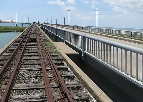 On May 15, 2024, a tugboat leaving Texas International Terminals, a container terminal next to the Pelican Island causeway, the only bridge connecting the island to the rest of Galveston, lost control of two barges it was pushing. One of the barges, operated by Martin Operating Partnership, then hit the bridge and two telephone poles at approximately 10:00 CDT (3:00 GMT) collapsing a portion of the bridge, causing a diesel fuel spill, and causing a temporary power outage on the island. Two people were knocked off of the barge or jumped off, but they were quickly rescued. As a result of the collision, the bridge was closed.[3] The barge, which reportedly has a capacity of 30,000 U.S. gal (110,000 L), spilled between 1,000 U.S. gal (3,800 L) and 2,000 U.S. gal (7,600 L) of oil. Some spilled oil stayed on top of the barge and did not leak into the water.[4]