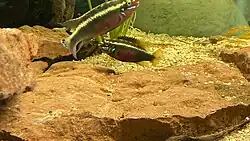Pelvicachromis sacrimontis is a freshwater fish of the cichlid family known only from a small area of southeastern Nigeria. Currently Fishbase considers this binomial to be a junior synonym of P. pulcher[1] and, it was also known as Pelvicachromis camerunensis, P. pulcher "form B" or P. sp. aff. pulcher but some authorities now consider it to be a valid species.[2] It is occasionally available in the tropical fish trade as "giant krib" and there are three colour morphs – red, green and yellow. And are the most colorful of the Pelvicachromis family. Today its popularity increases due to more order demands by aquarium hobbyists.