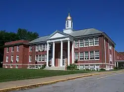A major expansion of the high school was dedicated February 5, 1932. The new construction mostly replaced the older building, which remained as a small wing on the north side of the building. The new building was faced in brick, Colonial in design, three stories high, with eight class rooms, and a combination gymnasium and auditorium seating 500. Altogether the combined grade and high school building consisted of about 40,000 square feet of space. The addition was constructed for $200,000 (USD) and designed for a capacity of 450 students. At the time of dedication, the total attendance was 265 students, of which 67 were in the high school.[17] In September 1934, Penfield High School had five "post graduates", four seniors, eleven juniors, thirty-seven sophomores, and forty-three freshmen.[18]