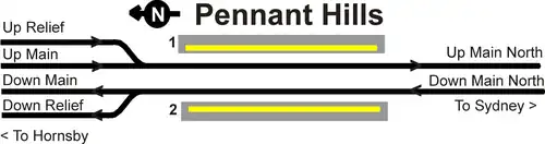 Pennant Hills station opened on 17 September 1886.[3] Immediately north of Pennant Hills, a short four track section of the Main Northern line begins which runs to the next station at Thornleigh.[4]