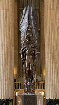 The monument features a 28-foot (8.53 m) heroic-sized bronze sculpture, Angel of the Resurrection, that portrays Michael the Archangel lifting up the soul of a dead soldier from the "flames of war". The sculpture is set upon an 11-foot (3.35 m) black-granite base, with two inscribed dedications and four bronze plaques listing the 1,307 names in alphabetical order. The work was designed and created by Walker Hancock (1901–1998), Instructor of Sculpture at the Pennsylvania Academy of the Fine Arts. Hancock served in the U.S. Army during World War II, and had been one of the "Monuments Men" who recovered art looted by the Nazis.