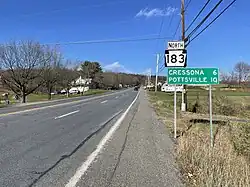 Pennsylvania Route 183 (PA 183) is a 31.7-mile-long (51.0 km) route that runs north to south in southeastern Pennsylvania. The southern terminus is at U.S. Route 422 Business (US 422 Bus.) in Reading in Berks County. Its northern terminus is at PA 61 near Schuylkill Haven in Schuylkill County. The road passes through developed areas near Reading before continuing north through rural areas, crossing from Berks County into Schuylkill County at Blue Mountain. PA 183 serves the communities of Bernville, Strausstown, and Cressona.