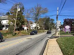 After passing the naval facility, Oxford Avenue continues northeast at the intersection with Robbins Street/Martins Mill Road and crosses Levick Street.[5] PA 232 runs north through the residential Lawncrest neighborhood and reaches the Five Points intersection with PA 73 (Cottman Avenue) and Rising Sun Avenue in the Burholme neighborhood. From this junction, the route passes a mix of urban residential and commercial establishments as it comes to a bridge over CSX's Trenton Subdivision railroad line at the Bleigh Avenue intersection and reaches a junction with Verree Road. PA 232 continues into the Fox Chase neighborhood, crossing SEPTA's Fox Chase Line at-grade south of its terminus at the Fox Chase station.[4][5] The route heads into the downtown area of Fox Chase and passes east of SEPTA's Fox Chase Bus Loop before coming to the Rhawn Street intersection, where the road makes a turn to the northwest.[4][5]