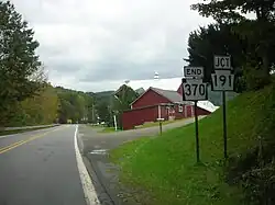 Pennsylvania Route 370 (PA 370, designated by the Pennsylvania Department of Transportation as SR 370) is a 16.73-mile-long (26.92 km) state highway located in Susquehanna and Wayne counties in Pennsylvania. The western terminus is at PA 171 in East Ararat. The eastern terminus is at PA 191 in Buckingham Township near Hancock, New York. PA 370 was first designated by the Pennsylvania Department of Highways in 1928 from the intersection with then PA 70 in East Ararat to an intersection with PA 570 in the hamlet of Preston Park (in Preston Township). The route was extended to an intersection with PA 90 (now PA 191) in 1946, when the 23-mile-long (37 km) PA 570 was decommissioned.