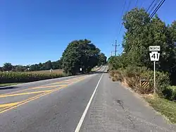 Pennsylvania Route 41 (PA 41) is a 22-mile-long (35 km) state highway located in southeastern Pennsylvania, United States. The southern terminus of the route is at the Delaware state line in Kennett Township, where the road continues as Delaware Route 41 (DE 41). The northern terminus is at U.S. Route 30 (US 30) in Gap. PA 41 runs northwest-southeast along a two-lane undivided road called Gap–Newport Pike, passing through mostly rural areas of Chester and Lancaster counties and serving Avondale, Chatham, Cochranville, and Atglen. The route serves as part of the main road linking Wilmington, Delaware, to Lancaster, Pennsylvania.