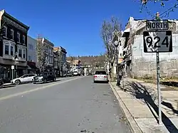 PA 924 begins at a junction with PA 61 in the borough of Frackville in Schuylkill County, heading north-northwest on two-lane undivided South Lehigh Avenue, which becomes North Lehigh Avenue upon crossing Frack Street a block later. The road passes businesses and homes in the downtown before bending west. The route heads northeast into forests and briefly runs through West Mahanoy Township before it crosses into the borough of Gilberton, where it becomes a four-lane divided highway called Gold Star Highway. PA 924 traverses the Mahantango Mountains, heading east before resuming back to the northeast. The highway passes to the west of a coal mine and comes to a bridge over the Mahanoy Creek and a Reading Blue Mountain and Northern Railroad line before it has an interchange with Main Street, which serves Gilberton. The route continues northeast near forests and coal mines, passing through a corner of West Mahanoy Township before entering the borough of Shenandoah. Here, PA 924 becomes a four-lane undivided road and passes businesses. The road crosses into Mahanoy Township and curves north in the community of Turkey Run, heading through wooded areas. The route crosses back into the borough of Shenandoah and becomes two-lane undivided South Main Street, running past homes and businesses. PA 924 heads into the downtown area and comes to an intersection with PA 54, where the name becomes North Main Street. The road continues past homes and businesses in the northern part of Shenandoah before it curves northwest.[2][3]