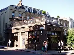 The Castle is a pub at No. 54 Pentonville Road, at the junction with Baron Street. In 2015, the perpetrators of the Hatton Garden safe deposit burglary met at the pub to discuss the crime shortly after it occurred, but were secretly filmed there by the Flying Squad. All were subsequently arrested and sent to prison. The current owners, Geronimo Inns, wish to distance themselves from the burglary and forbid staff to discuss it with customers.[24]