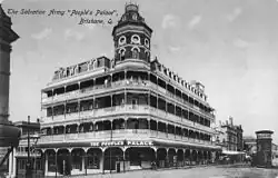 The People's Palace was built in 1910–1911 by the Salvation Army as a temperance hotel to provide inexpensive "working class" accommodation for travellers. It was designed by the Lieutenant-Colonel Saunders, the Salvation Army's architect and secretary for property affairs. It was situated across the road from the Temperance Hall operated by the Brisbane Total Abstinence Society. The People's Palace comprised three floors of accommodation with 130 rooms, a service basement and a rooftop garden. Construction commenced in March 1910 under Saunders' personal supervision.[3]