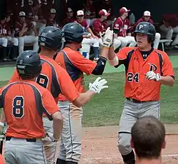 Pepperdine Waves baseball players celebrate a home run during a 2010 game