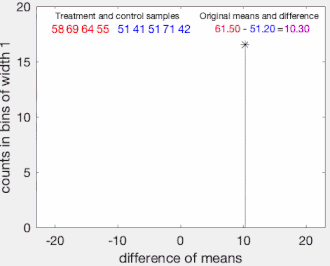 Animation of a permutation test being computed on sets of 4 and 5 random values. The 4 values in red are drawn from one distribution, and the 5 values in blue from another; we'd like to test whether the mean values of the two distributions are different. The hypothesis is that the mean of the first distribution is higher than the mean of the second; the null hypothesis is that both groups of samples are drawn from the same distribution. There are 126 distinct ways to put 4 values into one group and 5 into another (9-choose-4 or 9-choose-5). Of these, one is per the original labeling, and the other 125 are "permutations" that generate the histogram of mean differences shown. The p-value of the hypothesis is estimated as the proportion of permutations that give a difference as large or larger than the difference of means of the original samples. In this example, the null hypothesis cannot be rejected at the p = 5% level.