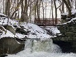 Silver Lake Trail footbridge near Main Street, overlooking secret waterfall behind a 200 year-old former mill.