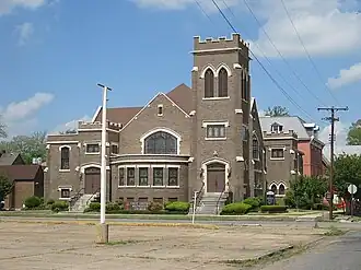 The Perry Street Historic District encompasses a fine collection of early-20th century architecture in Helena–West Helena, Arkansas. It includes fifteen buildings, arrayed on the single city blocks stretching south and west from the junction of Perry and Pecan Streets. The buildings on these blocks represent a cross-section of private and public architecture spanning 1880–1930, including two churches, the only synagogue in Phillips County (the 1913 Temple Bethel), and the county's oldest public building, the 1879 Helena Library and Museum. Most of the residences in the district were built between 1900 and the 1920s. Although most of the residential architecture is Arts and Crafts in style, it includes two fine Queen Anne Victorians: the Moore House at 608 Perry (built 1900) and the William Nicholas Straub House at 531 Perry (also built 1900).[2]