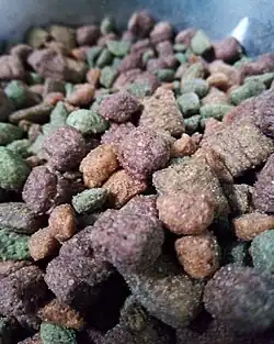 Pet food is animal feed intended for consumption by pets. Typically sold in pet stores and supermarkets, it is usually specific to the type of animal, such as dog food or cat food. Most meat used for animals is a byproduct of the human food industry, and is not regarded as "human grade".[1] Examples of foods for pets would be canned foods and dry mix.[2] Pet food production has environmental, land-use and climate change impacts.