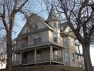 The Peter J. Paulsen House is a historic building located on the hill above downtown Davenport, Iowa, United States. The Queen Anne style residence was built by Peter J. Paulsen, who operated a grocery store on West Second Street. It exhibits the features that are characteristic of this popular late 19th-century style: an asymmetrical composition, irregular roofscale, and a corner tower with a conical roof.[2] The tower itself rises out of an oriel window on the first and second floors. The Paulsen house also maintains some if its exterior features, including scallop-shaped wall shingles in the gables and narrow clapboards. The south gable also contains a Palladian window and the front gable a semicircular window. The house has been listed on the National Register of Historic Places since 1983.[1]