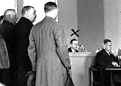 On 13 April 1931, Kürten stood trial in Düsseldorf. He was charged with nine counts of murder and seven of attempted murder, and was tried before Presiding Judge Rose. Kürten pleaded not guilty by reason of insanity[30] to each of the charges.[94] Aside from when delivering testimony, Kürten would spend the duration of his trial surrounded by a heavily guarded shoulder-high iron cage specifically constructed to protect him from attack by the enraged relatives of his victims,[13] and his feet were shackled whenever he was inside this cage.[95]