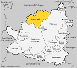 Ammerbuch (German pronunciation: [ˈamɐbuːx]) is a municipality in the district of Tübingen of Baden-Württemberg, Germany. It is situated 7 km northwest of Tübingen and between 345 and 551 meters above sea level. The name Ammerbuch is a portmanteau of the two locations between which the municipality is situated — Ammer Valley and the Schönbuch nature park.