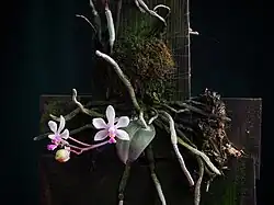 The 1 cm long stems produce 4-5 oblong to subelliptic, 6.5-8 cm long and 2.6-3 cm wide leaves and greenish, well developed, dorsiventrally flattened, verrucose roots. The leaves often show purple colouration of the abaxial surface and they are shed before flowering, but sometimes 1-2 leaves persist. Flowering occurs throughout April to July. Widely and simultaneously opening, pink flowers are produced on 1-2 suberect or arching, 10-15 flowered racemes. The plants are epiphytes or lithophytes on damp rock found at elevations of 800-2200m a.s.l.[3] The chromosome count is 2n = 2x = 36.[4]