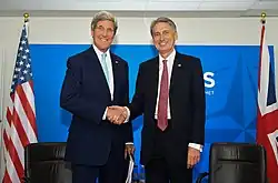On 14 July 2015, after several years of on-again-off-again negotiations, the P5+1 reached agreement with Iran over the Nuclear program of Iran. Hammond was present in Vienna as the UK representative for the Joint Comprehensive Plan of Action disclosure ceremony.[40] Hammond presented the deal in Commons the next day,[41] and was in Jerusalem for a joint press conference with Benjamin Netanyahu, which was described as "tense".[41][42]