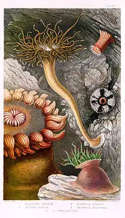 During this period, Gosse made a special study of sea anemones (Actiniae) and in 1860 published Actinologia Britannica. Reviewers especially praised the colour lithographs made from Gosse's watercolours. The Literary Gazette said that Gosse now stood "alone and unrivalled in the extremely difficult art of drawing objects of zoology so as to satisfy the requirements of science" as well as providing "vivid aesthetic impressions".[80]