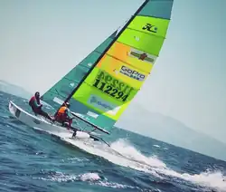 The 16 is the most popular Hobie Cat, both for recreational and racing purposes and as a one-design racer. The boat is 16'7" long, 7'11" wide, and has a mast 26'6" tall, but only weighs 320 pounds. As with the 14, it is intended to be sailed from the beach through the surf, and to be surfed back in on the waves to the beach. Instead of daggerboards or centreboards, the 16 has asymmetrical hulls which act like foils and keep the boat from crabbing, or slipping sideways from the force of the wind. Both jib and main sails are fully battened and total 218 square feet (20 m2). A trapeze is usually used by the crew and helmsman.