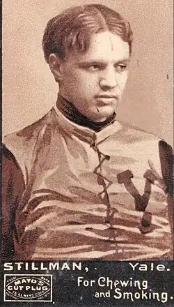 Stillman enrolled at Yale College in approximately 1892 as a transfer student for his junior year.[1][2][7] He played for three years on the Yale Bulldogs football team.[6] He was the center on the 1894 Yale Bulldogs football team that compiled a 16–0 record and was retroactively named co-national champions by the Billingsley Report, Helms Athletic Foundation, National Championship Foundation, and Parke H. Davis.[8] At the end of the 1894 season, Stillman was a consensus choice as a first-team player on the 1894 College Football All-America Team.[9] Caspar Whitney, published in Harper's Weekly magazine, and Leslie's Weekly by John D. Merrill.[10]