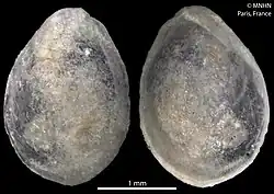 Philobryidae is a taxonomic family of very small equivalved triangular saltwater clams, marine bivalve molluscs, related to the ark clams and the bittersweets. Their shells have projecting umbones and are non-nacreous. The ligament of the hinge is either completely internal or only slightly external. They have only one adductor muscle scar on the inside of each of their shells as opposed to the more-common two. Species from this family are found in most seas, in shallow to moderately deep water. This family contains about sixty species in seven genera.