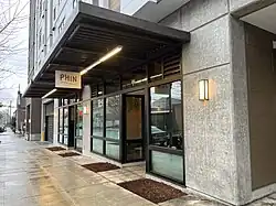 The 620-square-foot Vietnamese coffee shop Phin, which uses and is named after the coffee filter of the same name,[2] operates in the Thai Binh apartment building on South Jackson Street,[1] in the Little Saigon part of Seattle's Chinatown–International District.[3][4] The Seattle Times has described the shop as "inviting", "small", "stylish", and "tranquil", with a faux balcony in one interior corner.[5][6] According to Naomi Tomky of the Seattle Post-Intelligencer, "The stylish inside manages to evoke both Vietnam and another era through muted colors on the wall, painted red details, and a decorative balcony, but also through design."[7]