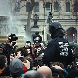 In the United Kingdom there are no laws forbidding photography of private property from a public place. Photography is not restricted on land if the landowner has given permission to be on the land or the photographer has legal right to access, for example Byways Open to All Traffic or a public right of way or an area of open access land. The Metropolitan Police state in their own advice "Members of the public and the media do not need a permit to film or photograph in public places and police have no power to stop them filming or photographing incidents or police personnel". The IAC, Film and Video Institute recommends that one follows instruction given by police as there may be a reason/reasons for not filming, ignorance of said law(s) notwithstanding.[5] An exception is an area that has prohibitions detailed within anti terrorism legislation. Civil proceeding can be taken if a person is filmed without consent, and privacy laws exist to protect a person where they can expect privacy.[6][7] Two public locations in the UK, Trafalgar Square and Parliament Square, have a specific provision against photography for commercial purposes without the written permission of the Mayor[8][9] or the Squares' Management Team and paying a fee,[10] and permission is needed to photograph or film for commercial purposes in the Royal Parks[11] or on any National Trust land.[12]