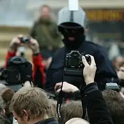 It is contempt of court to take a photograph in any court of law of any person, being a judge of the court or a juror or a witness in or a party to any proceedings before the court, whether civil or criminal, or to publish such a photograph. This includes photographs taken in a court building or the precincts of the court.[14] Taking a photograph in a court can be seen as a serious offence, leading to a prison sentence.[15][16] The prohibition on taking photographs in the precincts is vague. It was designed to prevent the undermining of the dignity of the court, through the exploitation of images in low brow "picture papers".[17]