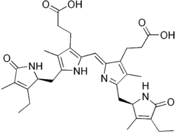 • InChI=1S/C33H42N4O6/c1-7-20-19(6)32(42)37-27(20)14-25-18(5)23(10-12-31(40)41)29(35-25)15-28-22(9-11-30(38)39)17(4)24(34-28)13-26-16(3)21(8-2)33(43)36-26/h15,26-27,35H,7-14H2,1-6H3,(H,36,43)(H,37,42)(H,38,39)(H,40,41)/b28-15-/t26-,27+/m1/s1 checkY