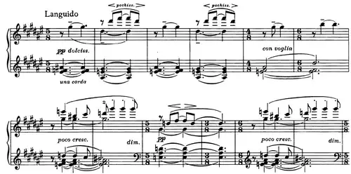 | Coda | 401–457 | The coda is modified so as to lead to a climatic fff statement of the languido theme, followed by the ascending rush of the first musical idea. |