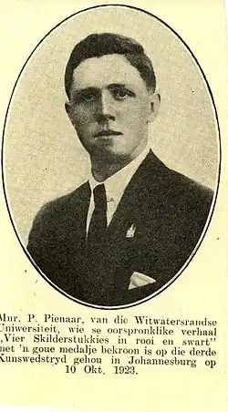 Pierre de Villiers Pienaar was born on 11 August 1904 on the farm Elandsfontein, Gatsrand (currently in the Fochville district), that was destroyed in The Anglo-Boer War during the scorched earth text campaign.[4] He attended the primary farm school on Elandsfontein, and then went to Boy's High, Potchefstroom, where he matriculated in the first class in 1921. In 1922 he entered the university of the Witwatersrand and the Johannesburg Teachers Training College. He received the B.A. degree in education the beginning of 1925, and later that year the Honours B.A. degree in the first class. In 1926 the University of the Witwatersrand awarded him the degree Master of Arts with distinction for his research in phonetics and general linguistics.[4] The following year Pienaar was awarded a union bursary to further his studies in Utrecht, Netherlands (September 1927 – April 1928), and Hamburg, Germany (1928–1929), where he continued his research in general linguistics and the phonetics of Afrikaans at the Department of Experimental Phonetics of the University of Hamburg. Here, under the leadership of Prof. G. Panconcelli-Calzia, he was awarded the PhD degree in 1929.[4]