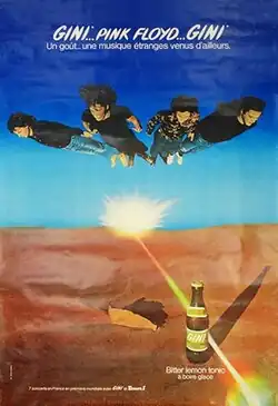 The English rock group Pink Floyd played two tours in 1974. As well as performing the hit album The Dark Side of the Moon live, the band introduced new material that would eventually be recorded on the albums Wish You Were Here and Animals. Part of the tour was sponsored by the soft drink company Gini.