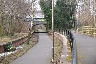 The disused track bed is now a cycle and footpath, forming part of the City of Edinburgh Council's Quiet Route 9.[2] The platforms and ticket office of the former station remain in place.[3]